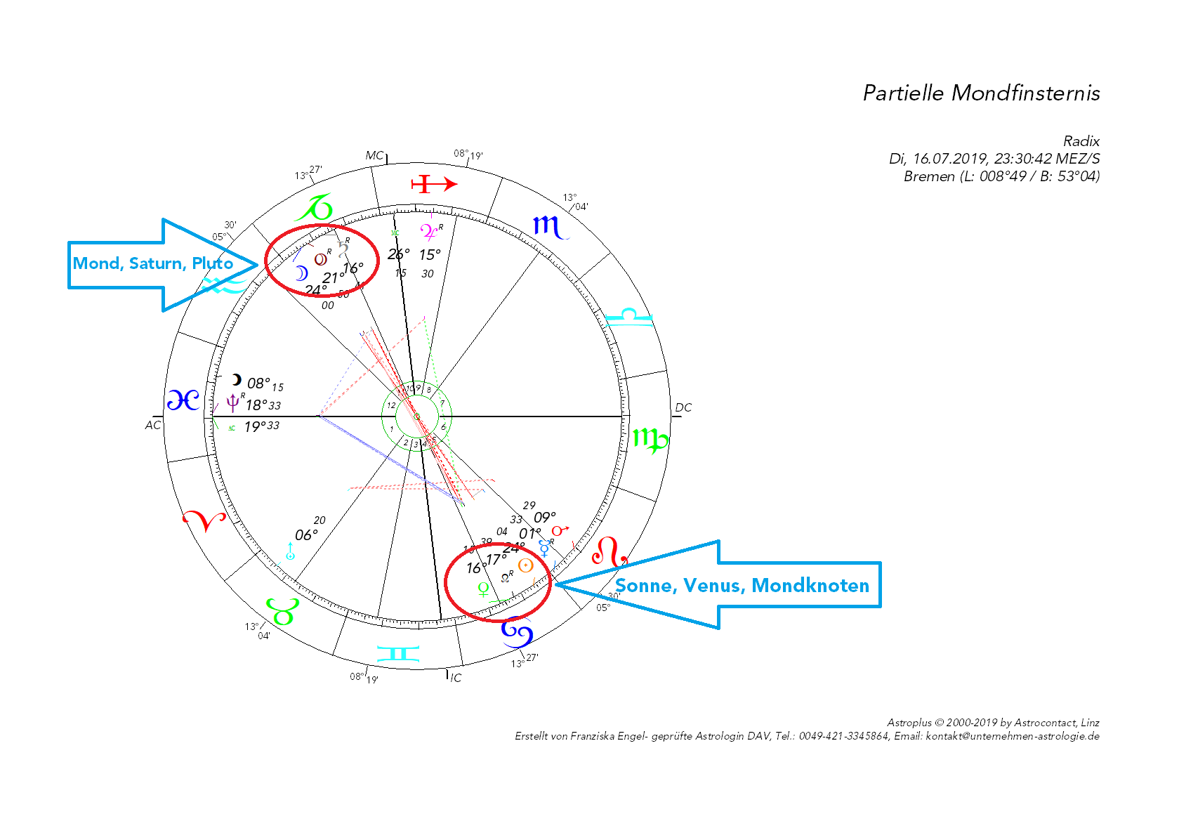 Horoskopgrafik der Mondfinsternis am 16. Juli 2019 berechnet auf den Standort Bremen.