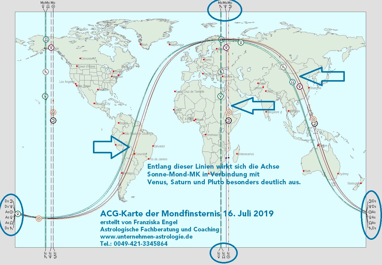 Und geografisch wird anhand der Astrokartografie-Karte deutlich, wo auf der Welt der Einfluss am unmittelbarsten auftritt: